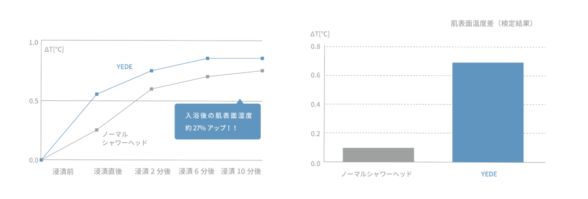 一般的なシャワーヘッドに比べて、お肌の表面温度の上昇率が6倍も高くなり、カラダがより温まりやすくなります。また、浴槽に2/3程度のお湯をため、残りの1/3程度をYEDE by marbbでためることで、お手軽にナノバブル温浴をすることができます。
